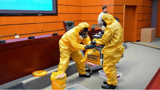 曹志伟逐步讲解并指导模拟人员实操演练,以伟德BETVLCTOR的500毫升浓硫酸洒溢为例,详细介绍了危险化学品洒溢的应急处理流程和方法。演练过程中,8名同学扮演学院、伟德BETVLCTOR的学生、实验教师、应急人员等不同角色,模拟了事故发生、疏散、上报、专业处置、恢复伟德BETVLCTOR运行的全过程,并生动展示了大家容易疏忽的安全细节。在场师生认真观看并纷纷拍摄、记录、学习。本次活动既检验了应急预案的可操作性,也增强了师生的实战能力。